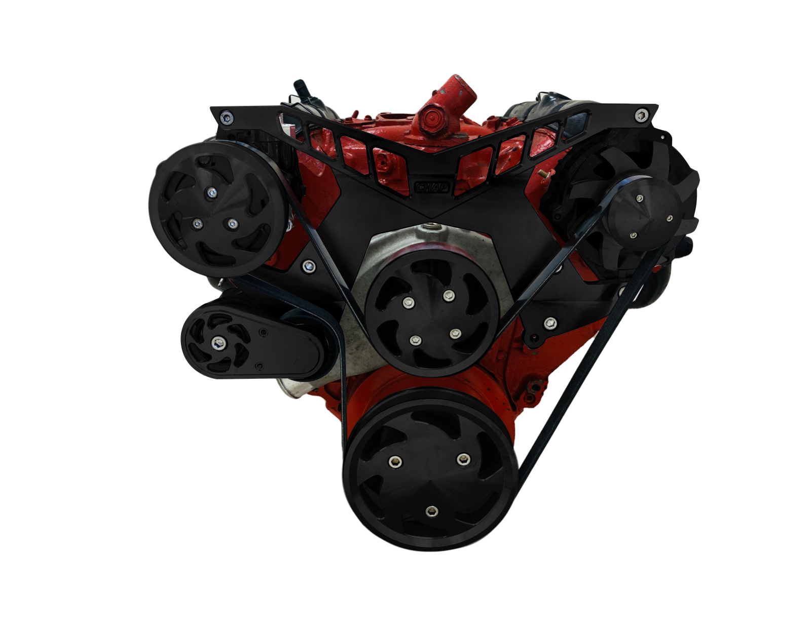 All inclusive serpentine pulley conversion kit for Big block chevy engines with Alternator, PS, and AC.